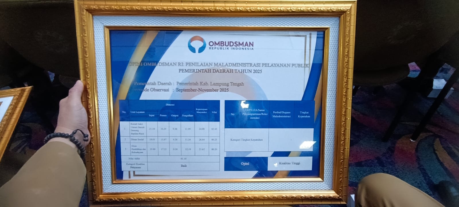 Lampung Tengah Raih 4 besar dengan nilai 81,10 Opini KualitasĀ Penilaian Maladministrasi Pelayanan Publik 2025.
