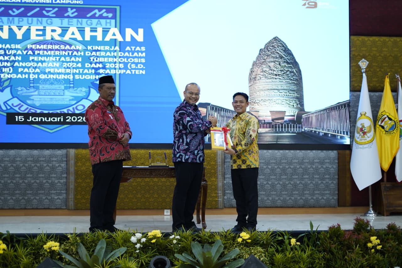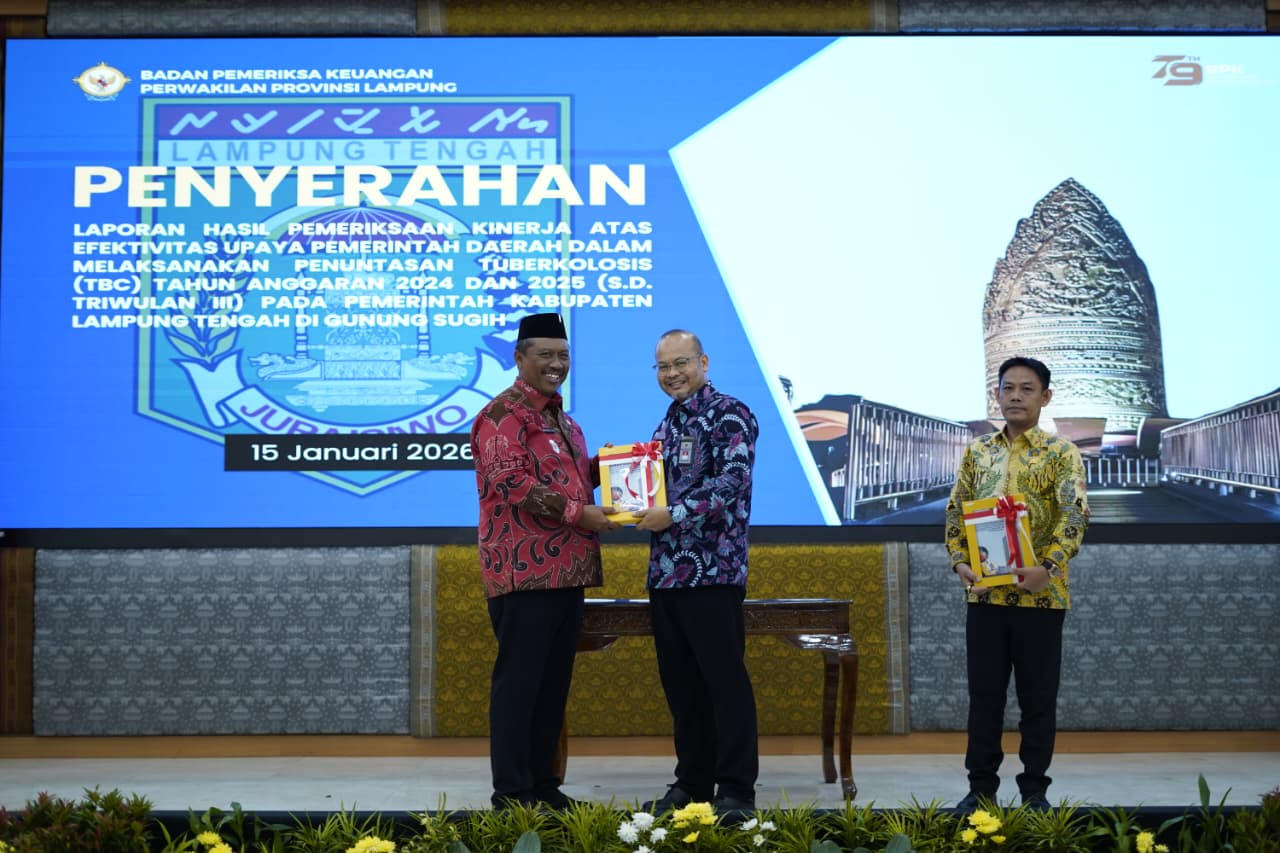 Pelaksana Tugas (Plt) Bupati Lampung Tengah, I Komang Koheri, bersama Ketua DPRD Kabupaten Lampung Tengah, Febriyantoni, menerima Laporan Hasil Pemeriksaan (LHP) dari Badan Pemeriksa Keuangan Republik Indonesia (BPK RI) Perwakilan Provinsi Lampung terkait kinerja atas efektivitas upaya pemerintah daerah dalam melaksanakan penuntasan tuberkulosis (TBC) Tahun Anggaran 2024 dan 2025 sampai dengan Triwulan II.