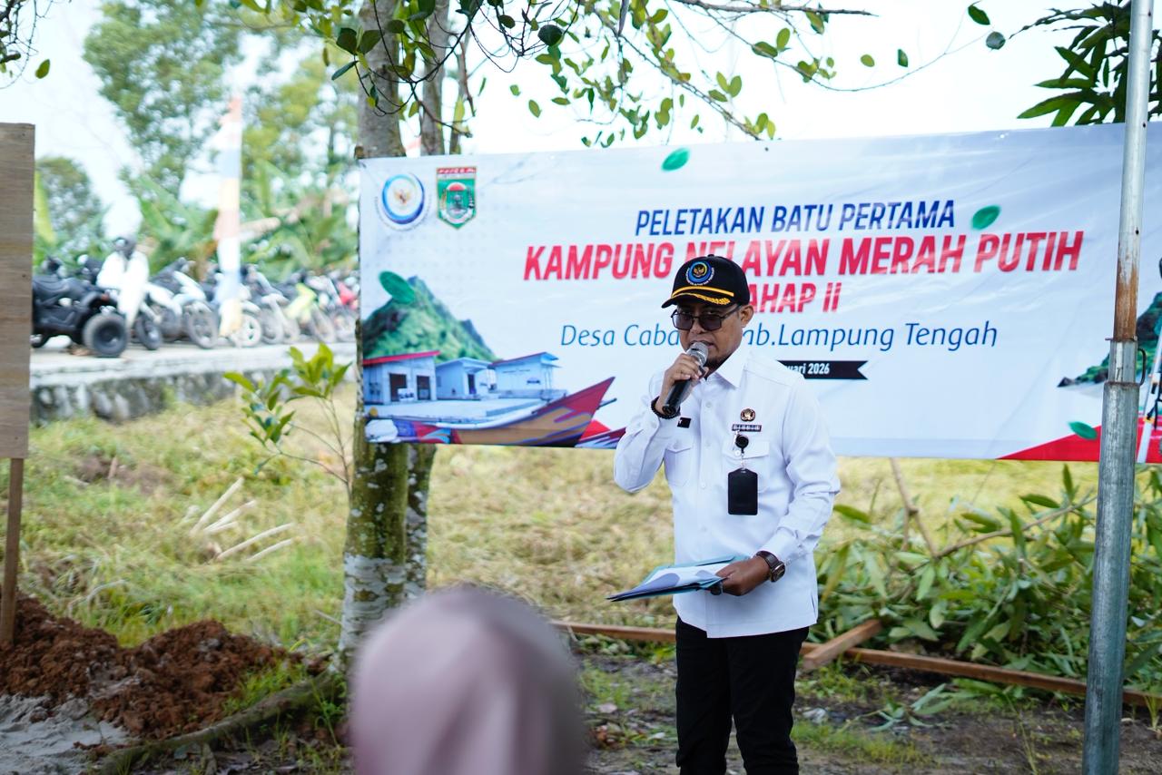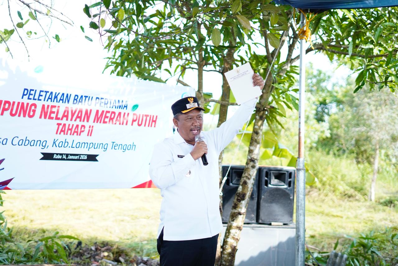 Pelaksana Tugas (Plt.) Bupati Lampung Tengah, I. Komang Koheri,S.E.,M.Sos secara resmi membuka sekaligus melakukan peletakan batu pertama Program Pembangunan Kampung Nelayan Merah Putih (KNMP) di Kampung Cabang, Kecamatan Bandar Surabaya, Rabu (14/01/2026).