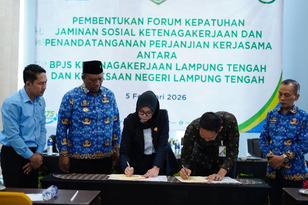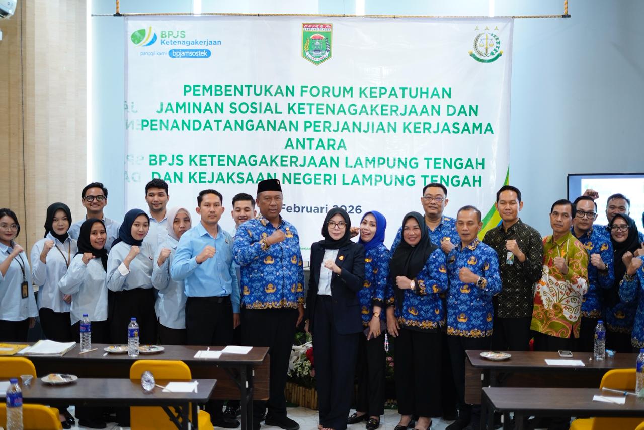 Komitmen Pemerintah Kabupaten Lampung Tengah dalam memperkuat perlindungan tenaga kerja kembali ditegaskan melalui kehadiran Pelaksana Tugas (Plt) Bupati Lampung Tengah, I Komang Koheri, S.E., M.Sos., pada kegiatan Pembentukan Forum Kepatuhan Jaminan Sosial Ketenagakerjaan sekaligus Penandatanganan Perjanjian Kerja Sama antara BPJS Ketenagakerjaan Lampung Tengah dengan Kejaksaan Negeri Lampung Tengah, yang dilaksanakan pada Kamis (5/2/2026).